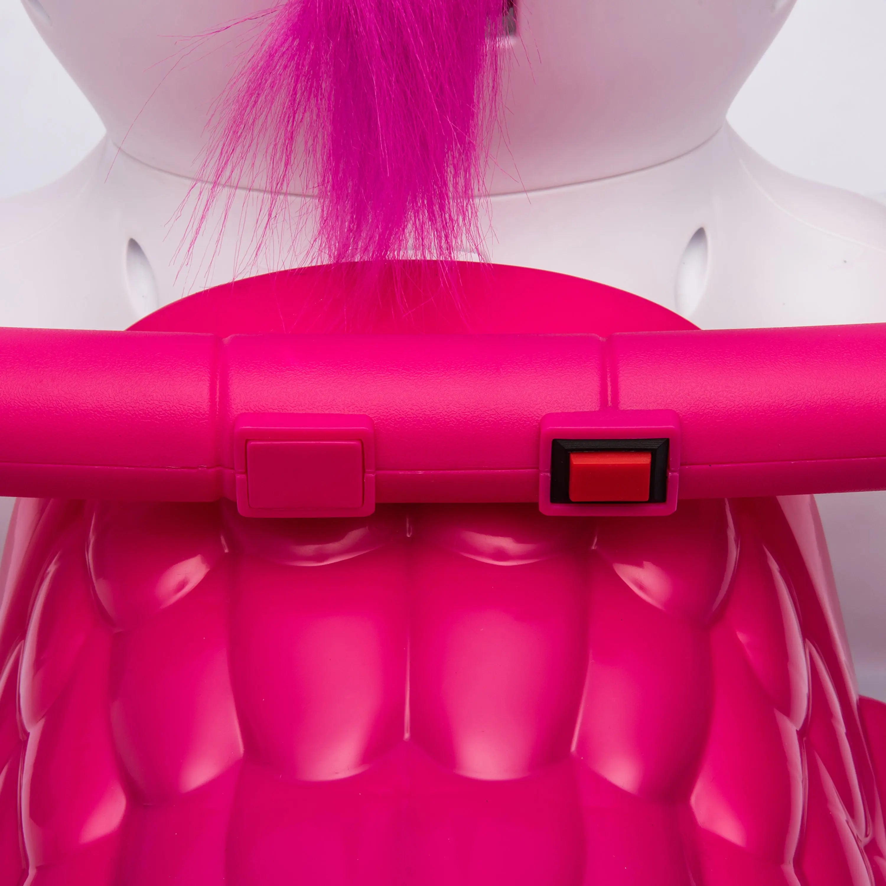 The ride-on is interactive and entertaining; it comes with a brush and comb so kids can playfully style the unicorn's plush mane and tail. An interactive carrot accessory, when held close to the unicorn's mouth, enchants young riders with realistic feeding sounds. Plus, there's a secret pocket in the saddle where kids can stow their gear for all-day adventures.